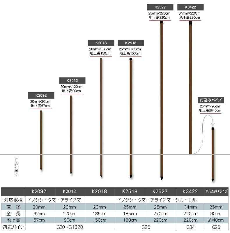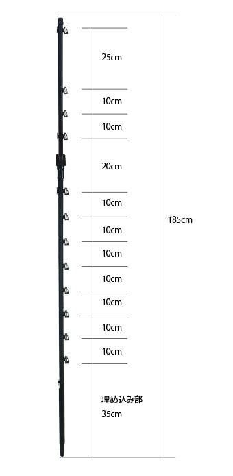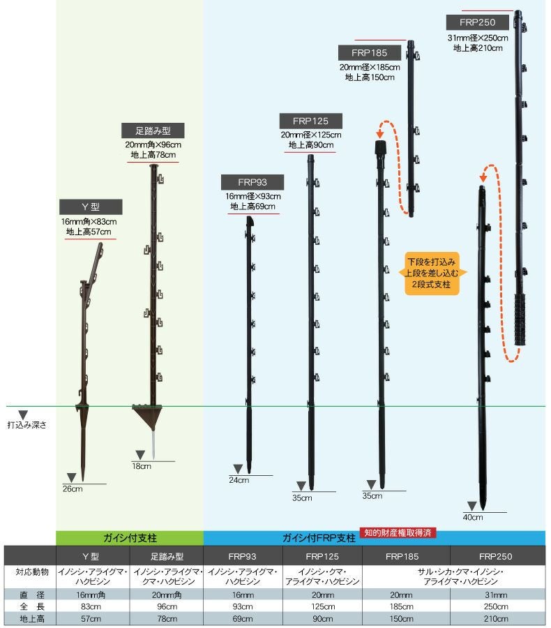 【対象:シカ、イノシシ、ハクビシン、アライグマ、クマ等】 ガイシが不要で設置の手間が大幅に軽減。FRPの強さとPPの柔軟性をあわせ持つ高品質ポール。上下ジョイント式で打ち込み作業が楽で安全です。 サイズ:20mm径×長さ185cm (上段60cm+下段125cm) 地上部高さ : 150cm