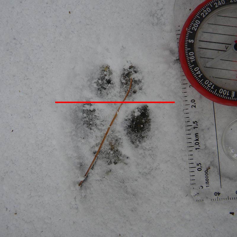 - タヌキやキツネの足跡と大きさは同じくらいだが、これら2種は指球が4つ。