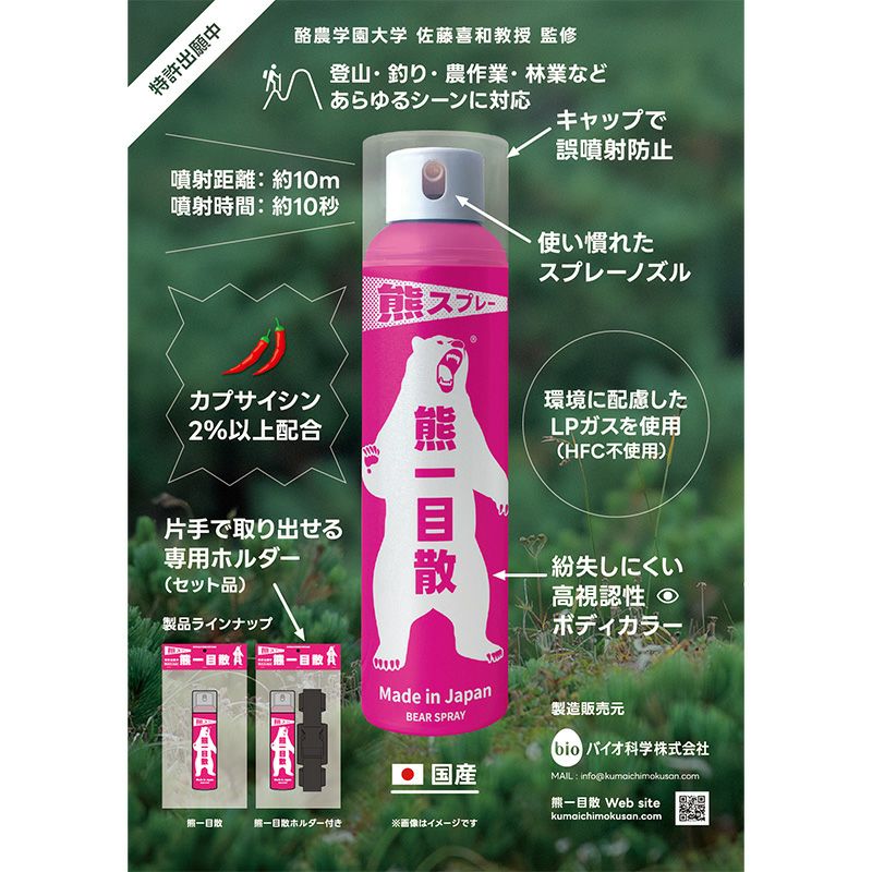 登山や渓流釣り、山菜採りなど、自然を楽しむすべての人に。 国内開発・国内製造の安心の国産クマスプレー「熊一目散」が、あなたの“もしも”を守ります。